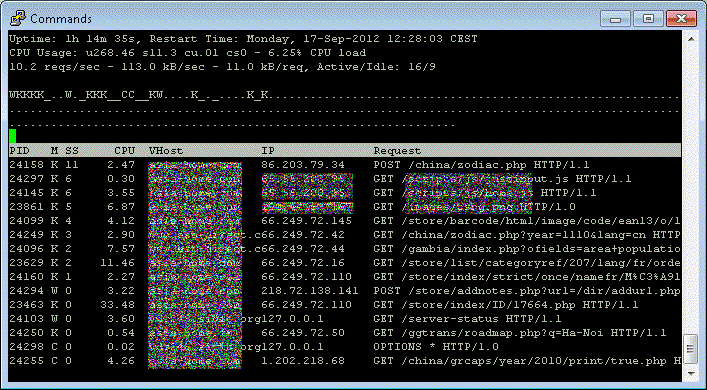 1. The active apache processes with their associated PID, the status, the seconds being active, the CPU usage, the asociated VirtualHost, the accessing ip and the request (POST or GET, the file being accessed and the used protocol).